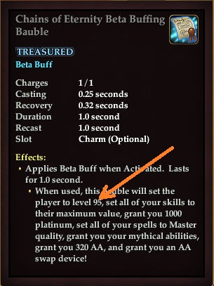 先日ベータサーバーにログインしたときは気づきませんでしたが、いつのまにか Beta Gearのほかに、Chains of Eternity Beta Buffing Bauble がメールで届くようになっていました。